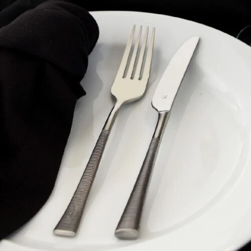 Make a statement with Tablekraft’s Aswan. Distinguishable by its 18/10 stainless steel striped oxidized handles, its unique design with smooth handles and satin head brings a mixture of modern and antique quality to any table setting.